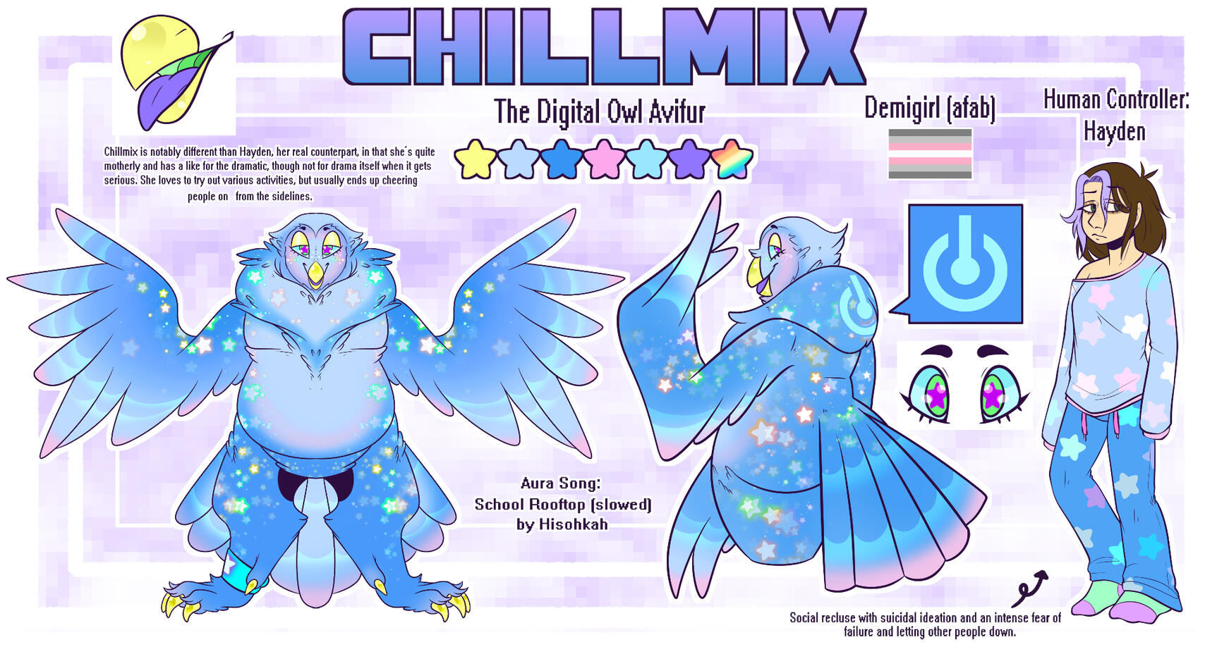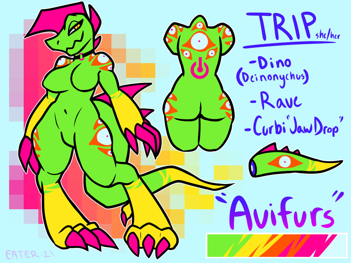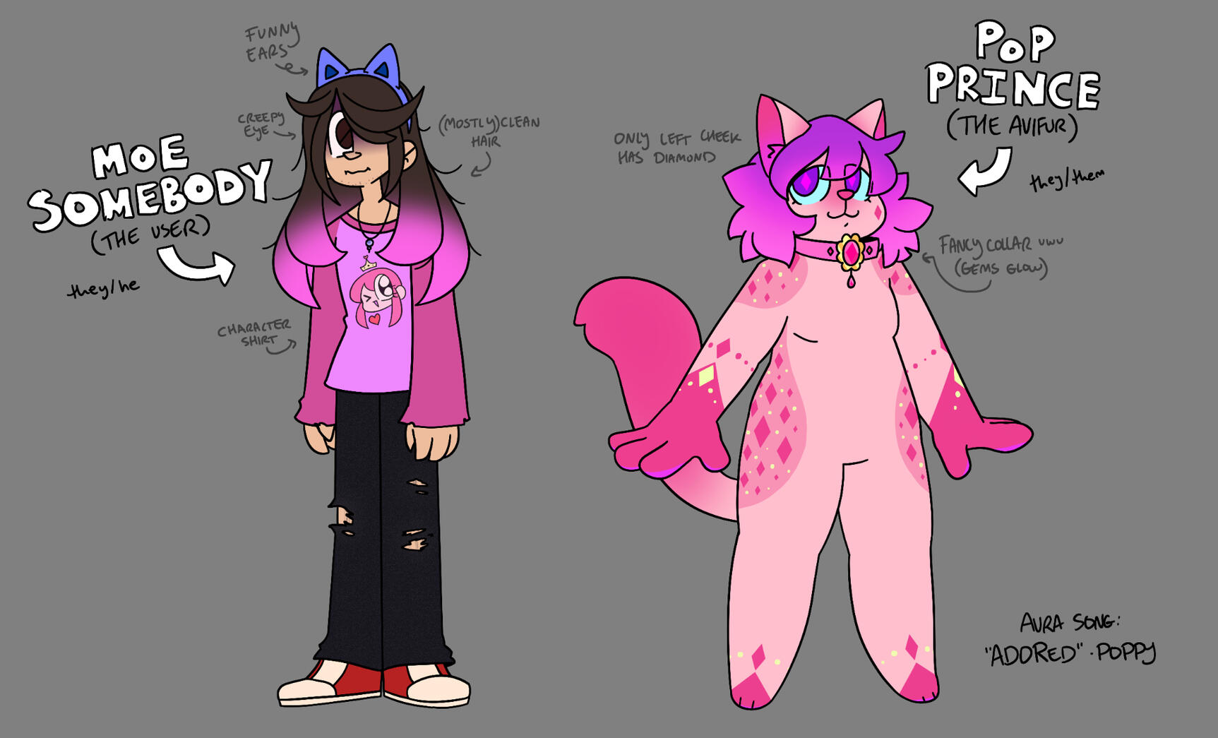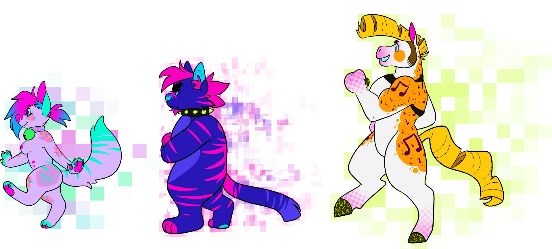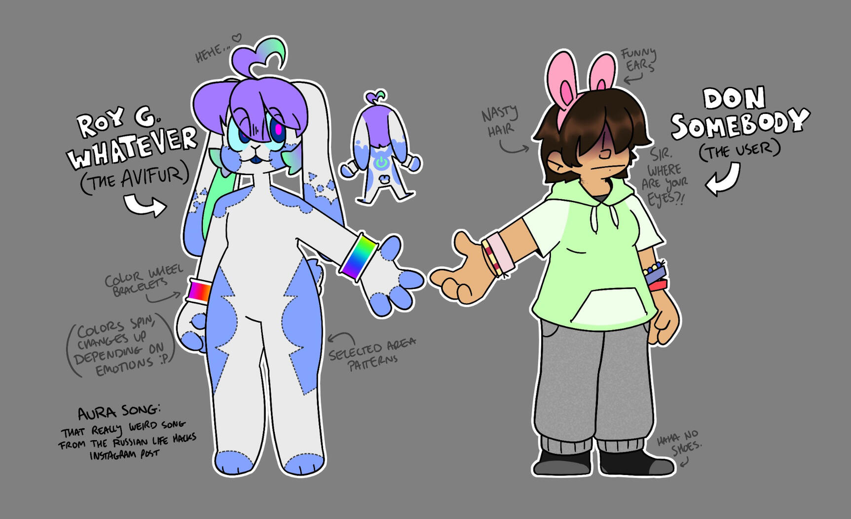 They can be ANY animal/combo of animal!They have a pixel effect that surrounds them at all times, trails behind them when they move and lingers a little before fading away!They are usually music themed (I.E Vaporwave, Nightcore, etc), but have been known to be general computer themed! (I.E Lovecore, CARTOONS, etc)They have a song that plays when they're nearby and it gets louder the closer they get! (I.E Vaporwave the Fox has MACINTOSH PLUS playing in his general aura and Nightcore the Tabby has "Nightcore - Rockefeller Street" in his aura.)They never have brown or natural/muted color palettes! A muted color palette on an AVIFUR means theyre unhappy or sick! Have fun with bright colors!